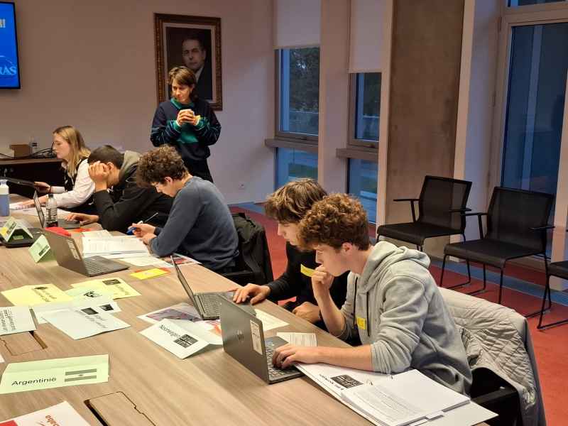 Op maandagavond 17 november 2025 kwam het scholierenparlement voor een eerste zitting samen in de Jacques Roggezaal van het Dienstencentrum. De verschillende deelnemers stelden zich voor en dan werd de zitting geopend. Europees commissievoorzitter Ursula Von der Leyen stelde een eerste motie voor waarin ze voorstelde om quota op te leggen om meer vrouwelijke parlementsleden te bekomen. De Iraanse mensenrechtenactiviste Narges Mohommadi was voorstander. De journalisten van Fox News vonden dat je dan misschien wel de beste kandidaat misliep. President Ortega vond quota niet nodig omdat in Nicaragua 45% van de parlementsleden toch al vrouwen zijn. Waarop Noorwegen de president grondig ging ondervragen over hoeveel die vrouwen eigenlijk wel te zeggen hadden ... Het rollenspel was begonnen. De leerlingen waren goed voorbereid, kenden hun rol en hadden sterke argumenten pro en contra opgezocht. Het debat verliep dan ook op een hoog niveau. Tijdens een korte pauze werd er onderhandeld. De moties werden bijgestuurd en bij de stemming kregen de geamendeerde moties een meerderheid, zelfs van de Zapatistas uit Mexico en van premier Wong van Singapore.